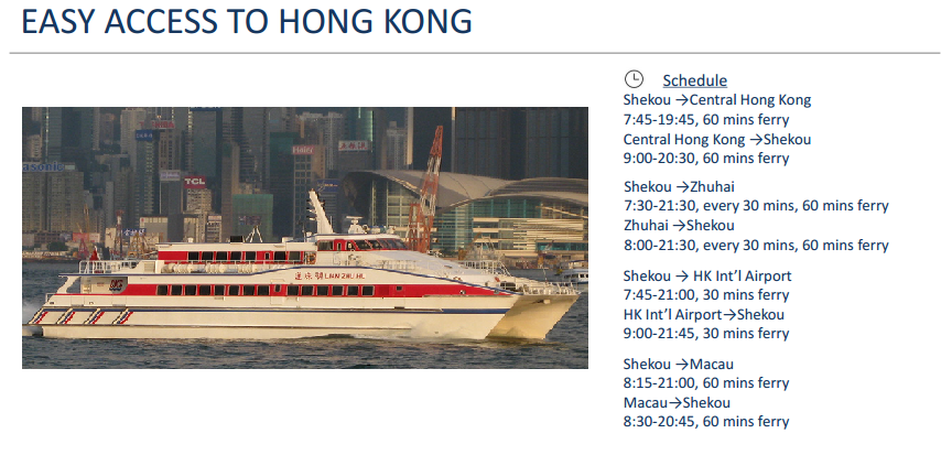 Shekou has direct ferry service from several ports including direct from Hong Kong international airport. If arriving from the airport shuttle, do not go through HK immigration and proceed directly to the ferry ticket counter.
