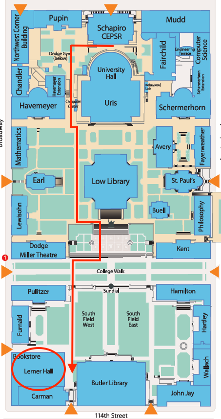 Exit Davis Auditorium, located in Schapiro CEPSR, and walk around Uris Hall (the business school) and past Low Library. Walk down the steps and across College Walk towards Butler Library. Lerner Hall will be located on your right towards the southwest corner of the campus.Visa Related Information